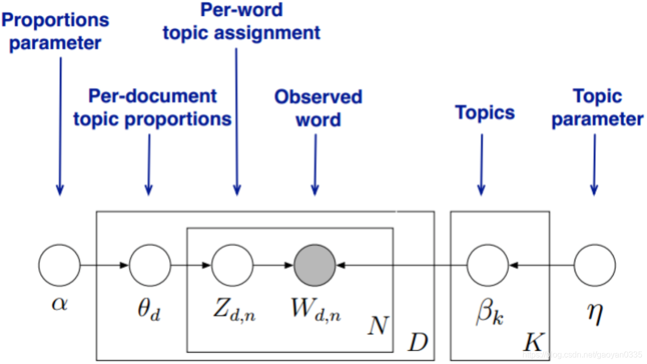 4. 然后根据该主题,从它的词分布βk中得到我们看到的词Wd,n = multi(βzdn)。