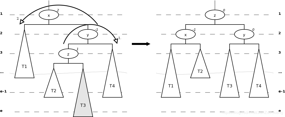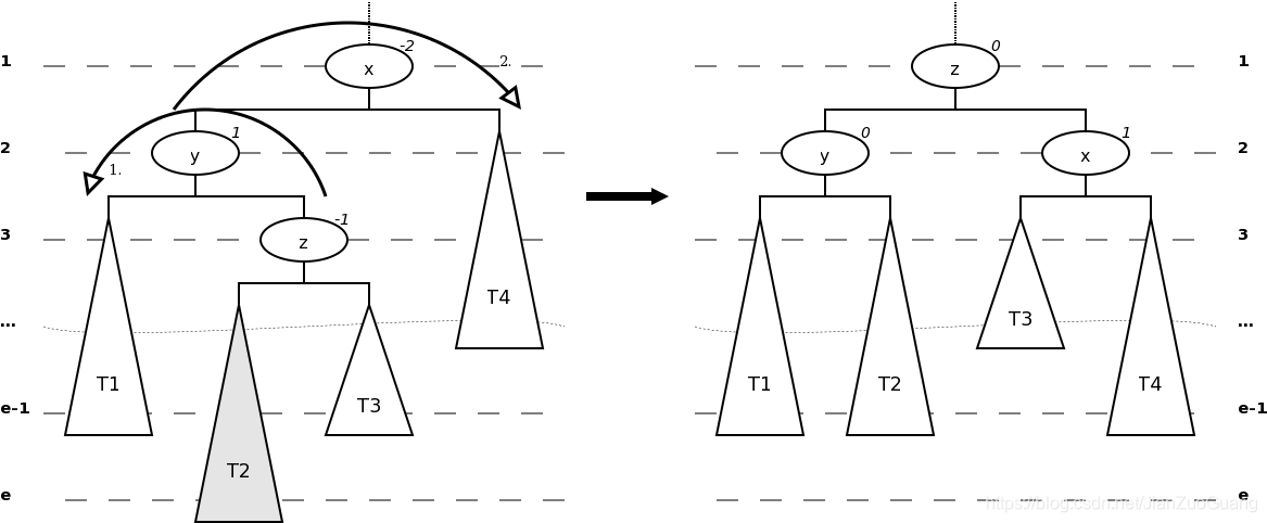 以下这种情况,通右旋转然后再左旋转来恢复平衡属性