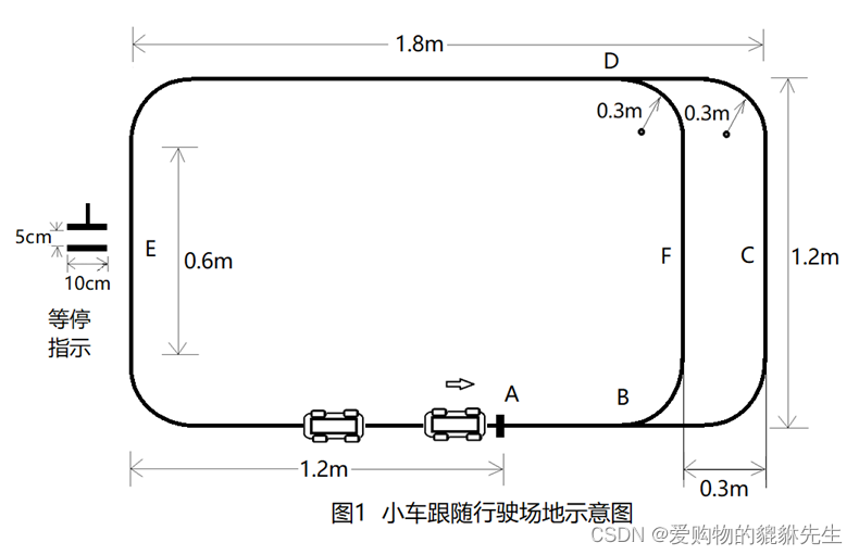 要求4:都沿着外圈行驶,领头小车放在路径的起始位置A点领头小车的速度为1m/s,平均速度误差不大于10%,速度范围0.9m/s~1.1m/s,小车循迹一圈时间范围:4.985s~6.093s,等停标志处停5s后继续向前行驶,达终点后停下。