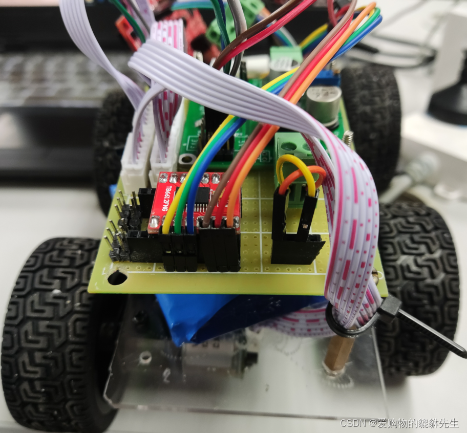 供电电路的焊接和车子的安装还是花了我们不少的时间,大概在第二天上午基本完成,且暂时缺少电机,于是用的两个万向轮和两个减速电机在初步调试。(现在拼出的车甚至可以丝滑地漂移,着实有点好van)