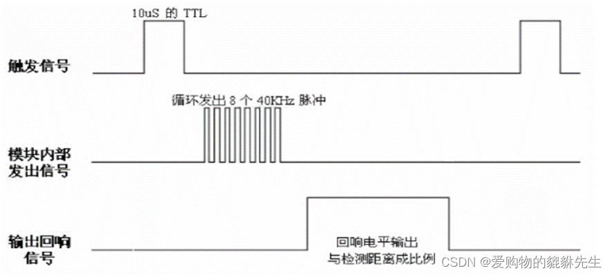 以上时序图表明你只需要提供一个10uS 以上脉冲触发信号,该模块内部将发出8个40kHz周期电平并检测回波。一旦检测到有回波信号则输出回响信号。回响信号的脉冲宽度与所测的距离成正比。