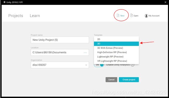 首先,打开Untiy创建一个3D的界面,点击New新建一个项目,然后点击Template下拉菜单选择3D,然后点击创建项目即可。