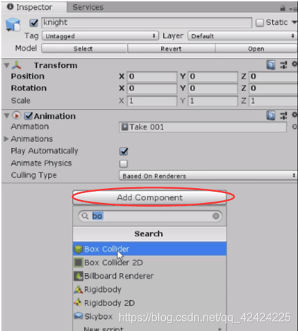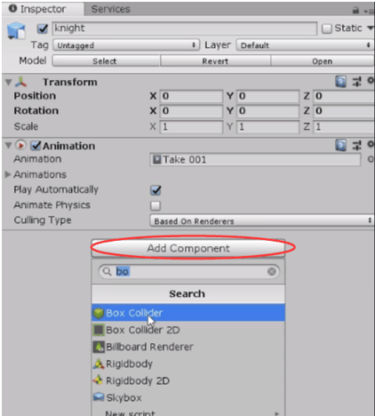 5.添加完人物之后,我们需要在Add Component里添加一个Box collider。