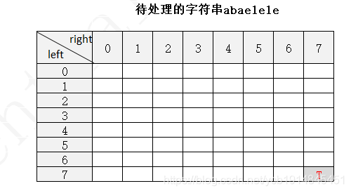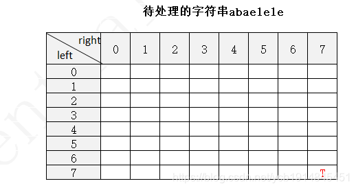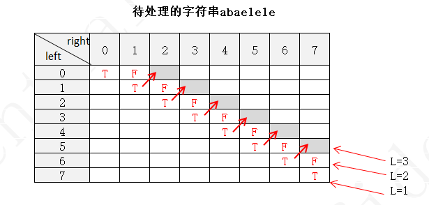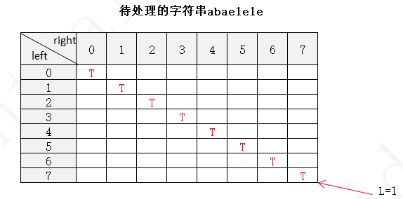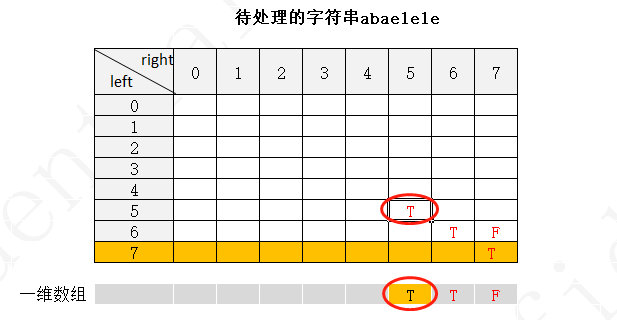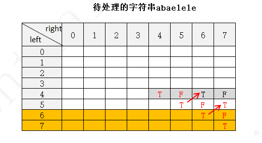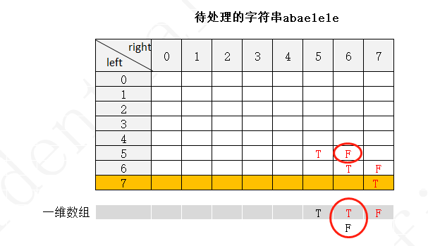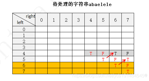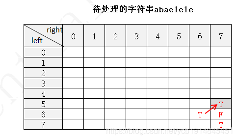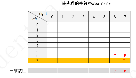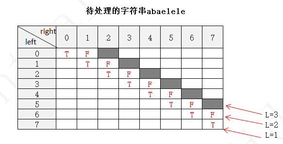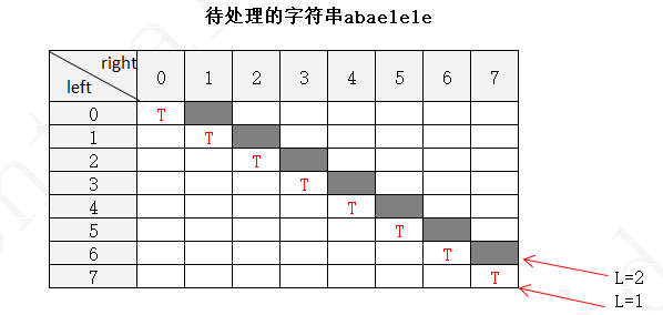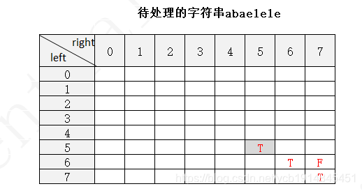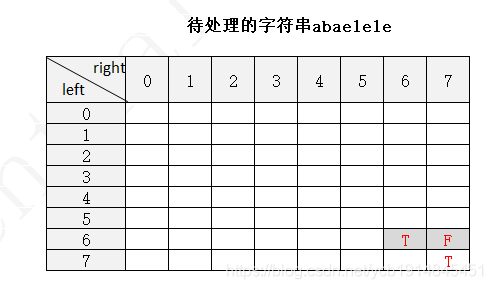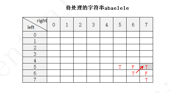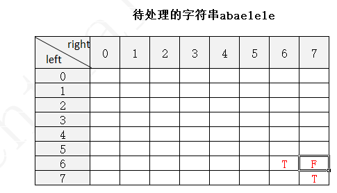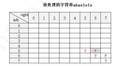 下面以字符串 abaelele 进行说明(注:下图中未填写数字的地方表示false,使用F表示,true用T表示)