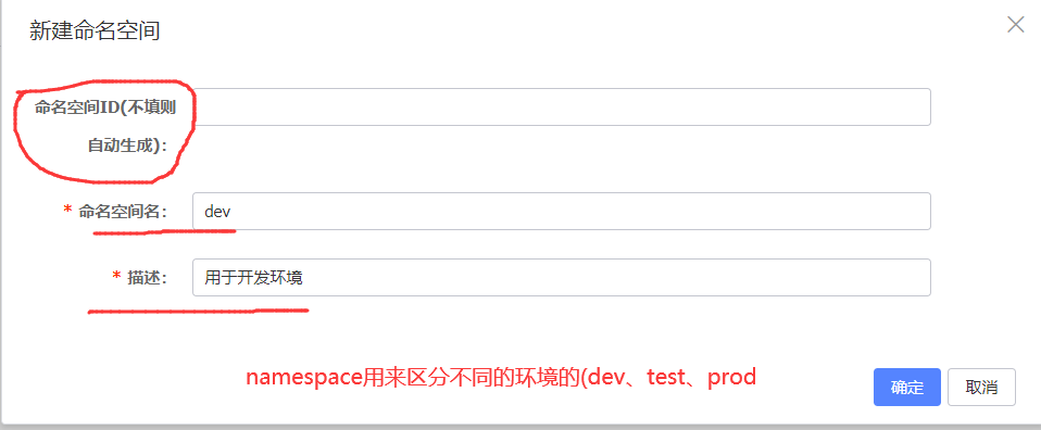 其 中 的 n a m e s p a c e 是 用 来 区 分 不 同 的 部 署 环 境 的 ( 例 如 d e v 、 t e s t 、 p r o d ) {其中的namespace是用来区分不同的部署环境的(例如dev、test、prod)}其中的namespace是用来区分不同的部署环境的(例如dev、test、prod)