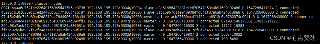 另外,使用命令src/redis-cli --cluster add-node 192.168.195.128:9008 192.168.195.128:9001加入9008服务,通过redis-cli -p 9008连接9008redis服务键入