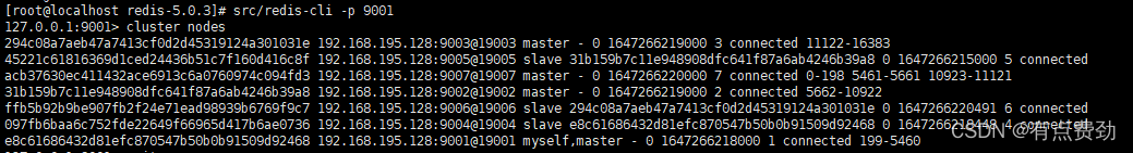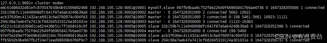 [OK] All 16384 slots covered通过redis-cli -p 9001命令连接redis集群服务,并输入cluster nodes可以查看redis节点信息