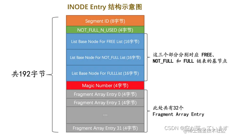 设计InnoDB的大叔为每个段都定义了一个INODE Entry结构来记录一下段中的属性。大家看一下示意图:
