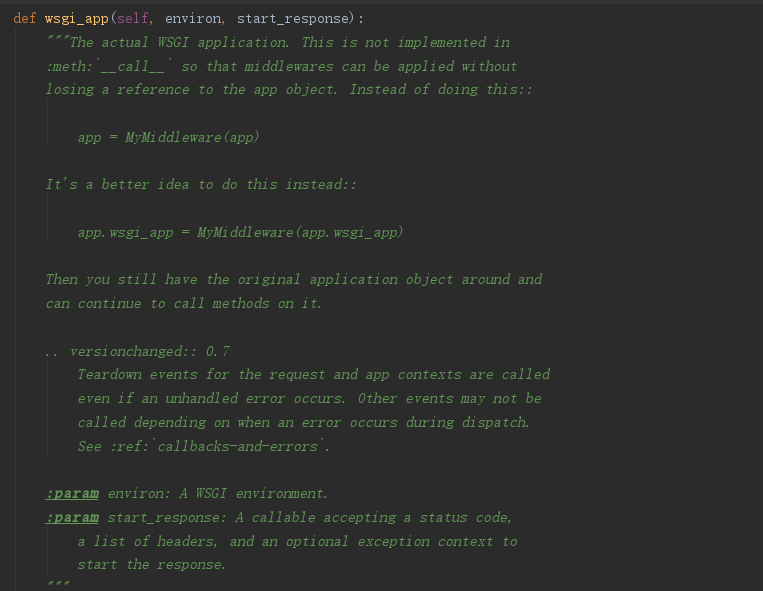 from flask import Flask app = Flask(__name__) @app.route('/') def index(): return 'Hello World!' # 模拟中间件 class Md(object): def __init__(self,old_wsgi_app): self.old_wsgi_app = old_wsgi_app def __call__(self, environ, start_response): print('开始之前') ret = self.old_wsgi_app(environ, start_response) print('结束之后') return ret if __name__ == '__main__': # 将原wsgi_app作为参数传入,即替换操作 app.wsgi_app = Md(app.wsgi_app) app.run()4-2 源码分析