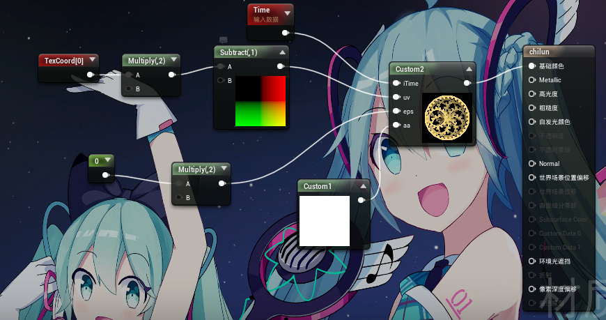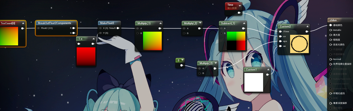 但是方向不对,这是因为UE的UV坐标在左上角,shadertoy的在左下角,我们 调整UV即可
