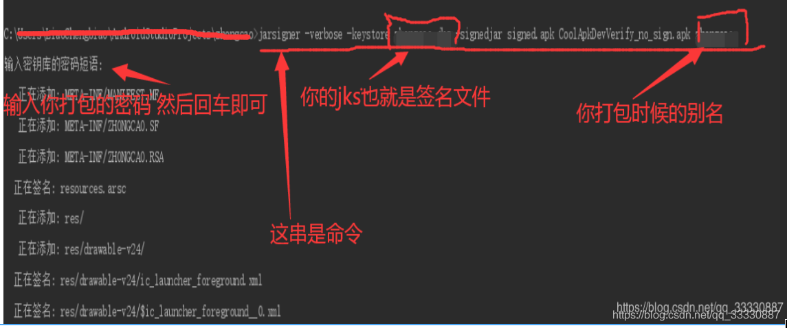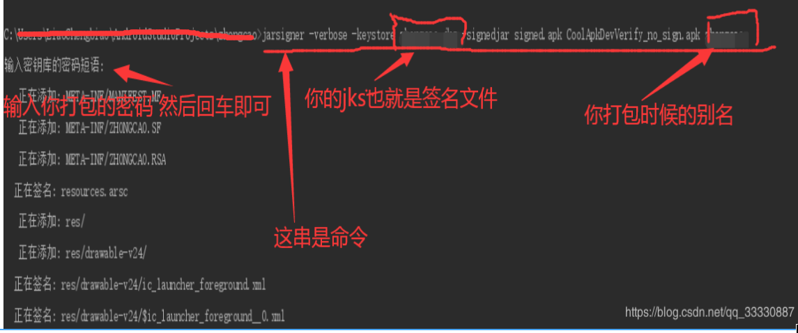 jarsigner -verbose -keystore 你的签名文件jks -signedjar signed.apk CoolApkDevVerify_no_sign.apk 你的别名