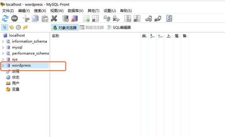 这时我们就能看到localhost界面左侧,出现了名为wordpress的数据库,也证明我们的数据库建立完成。