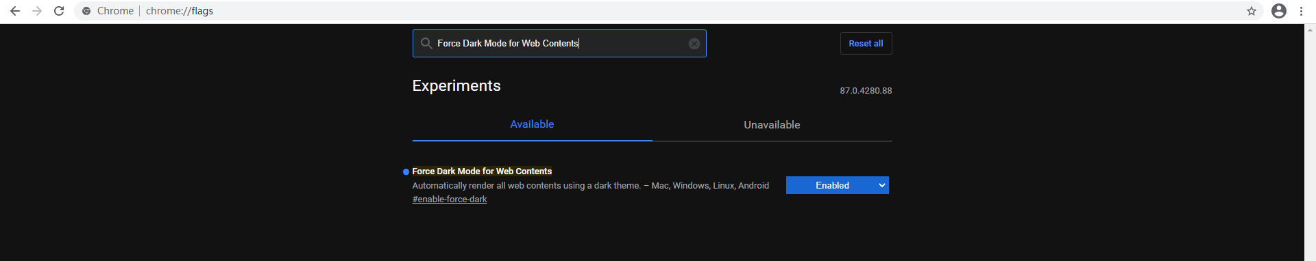 chrome的暗黑模式在地址栏中输入 chrome://flags/然后查找 Force Dark Mode for Web Contents 改为enabled即可效果如下图 版权声明:本文为easyboot原创文章,遵循CC 4.0 BY-SA版权协议,转载请附上原文出处链接和本声明。原文链接:https://blog.csdn.net/easyboot/article/details/111028023
