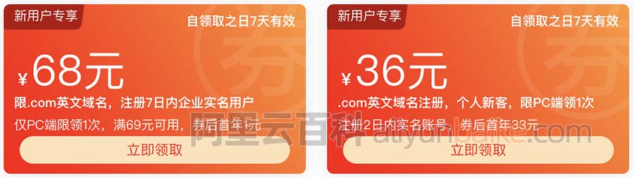 阿里云com域名注册原价为69元首年,阿里云老用户注册com域名为69元原价,如果是新用户,会更划算一些。阿里云企业新用户可以领取68元一年,券后1元首年;个人新用户可以领取36元券,券后注册com域名为33元首年,在阿里云CLUB可以领取专属的代金券aliyun.club 符合条件的订单可以抵扣。