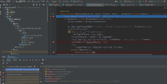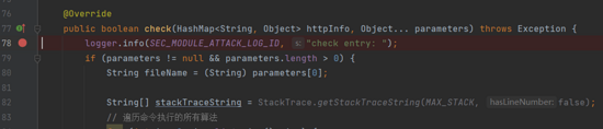 - 断点的位置尽量高,而且最好是在逻辑简单且必经之地。因为RASP代码逻辑是由目标Java应用触发,而不是我们手动触发的。另外建议多下几个断点,以保障IDEA可以正确捕获断点。