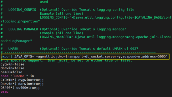 export JAVA_OPTS='-agentlib:jdwp=transport=dt_socket,server=y,suspend=n,address=5005'
