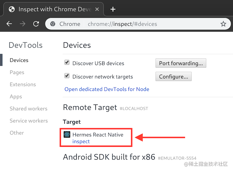 3.现在,会看到一个带有“inspect”链接的“Hermes React Native”目标,可以用来调出调试器;如果没有看到“inspect”链接,请确保Metro服务器正在运行。