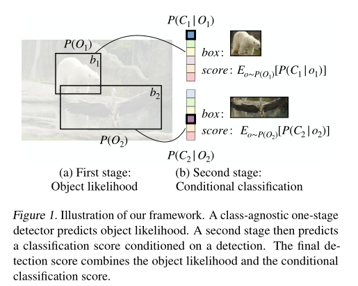 本文开发了一个两阶段目标检测的概率性解释。在标准两阶段检测器训练的基础上,提出一个简单的改进:对两个阶段联合概率目标的下界进行优化。通过概率性的处理,建议对两阶段检测器进行改进,具体的,第一阶段需要推断出校准的目标似然。目前两阶段检测器中的RPN是为了最大化proposal的召回而设计的,因此其不具备产生准确似然的能力。不过,功能完备的一阶段检测器却可以。