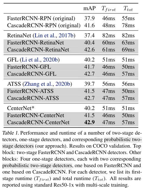 ATSS为每个对象使用自适应IoU阈值对一级检测器的分类可能性建模,并使用中心度校准分数。在概率两阶段检测baseline中,我们使用原始的ATSS,并对于每个proposal将其中心度和前景分类得分相乘。我们再次融合了分类和回归head,以稍微加速。
