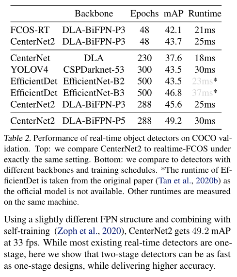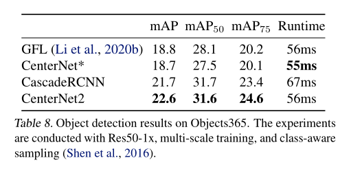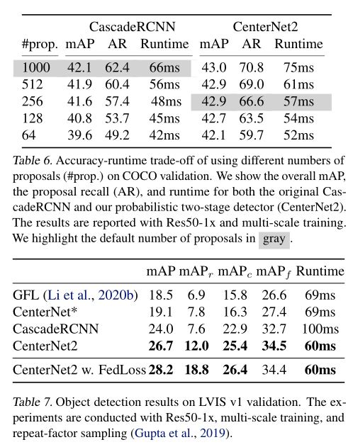 在COCO、LVIS、Objects 365上的实验表明,我们的概率性两阶段框架能够使Cascade RCNN的mAP提升1-3个点,且速度有所提升。使用以标准ResNeXt-101-DCN为backbone的CenterNet作为第一阶段,可以在COCO上达到50.2mAP。使用强大的Res2Net-101-DCN-BiFPN作为backbone并进行自训练,可以在单尺度测试上达到56.4mAP,这个结果超出了目前所有的公开成果。使用小的DLA-BiFPN作为backbone并降低输入分辨率,使用Titan Xp显卡在COCO上可以达到49.2mAP、33FPS,这个结果优于YOLOv4模型 (43.5 mAP at 33 fps)。