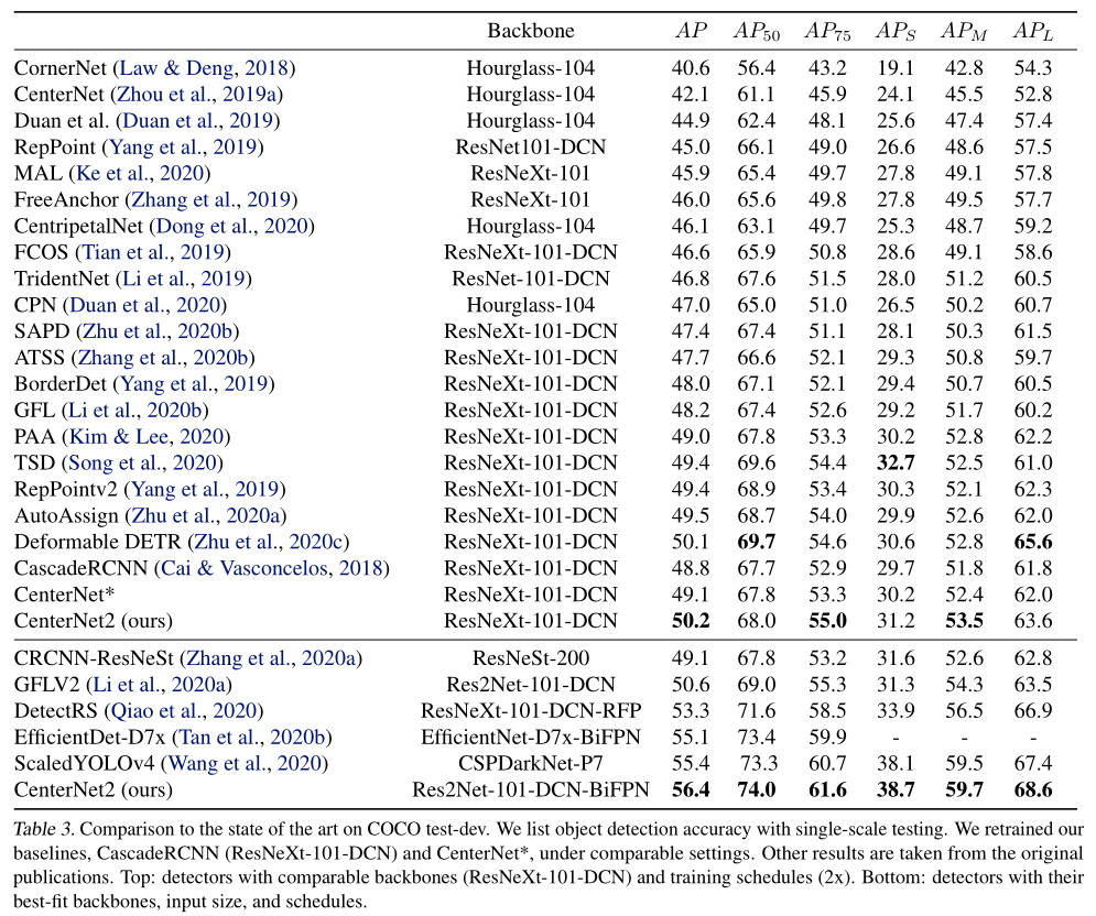 我们对概率两阶段检测器实例化了四个不同的backbone。我们使用默认的ResNet50模型进行大多消融及对比实验;使用ResNeXt-32x8d-101-DCN和SOTA方法进行比拼性能;使用轻量的DLA设计实时模型;使用一些最新的技术设计一个超大backbone来获取高精度。