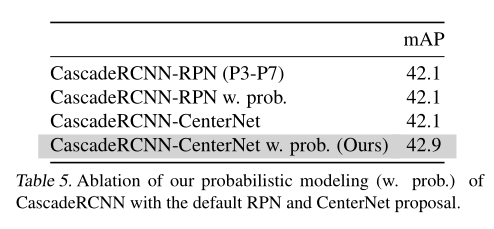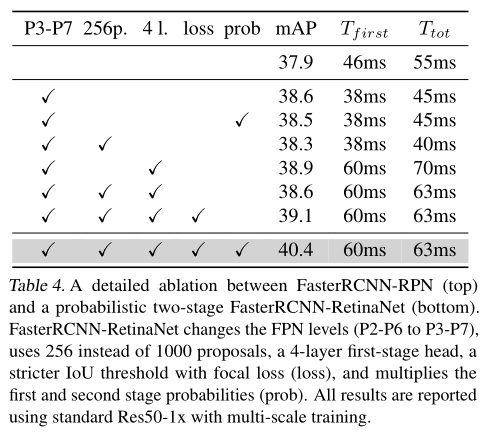 两阶段检测器通常使用FPN的P2~P6层级(输出步幅为4~64),而大多一阶段检测器使用FPN的P3~P7层级(输出步幅为8~128)。为了兼容两者,我们使用P3~P7。我们增大了正例IOU阈值,对Faster RCNN从0.5调整为0.6(对于CascadeRCNN调整为0.6,0.7,0.8),以补偿第二阶段IOU分布的改变。我们在概率二阶段检测器中使用最多256个proposal,而在基于RPN的模型中则默认使用1K个proposal。我们在概率两阶段检测器中同样增大了NMS阈值,从0.5调整到0.7,因为我们的proposal数量更少。这些超参的改变对于概率检测器很有必要,但我们实验发现它们对于基于RPN的检测器却没有提高。