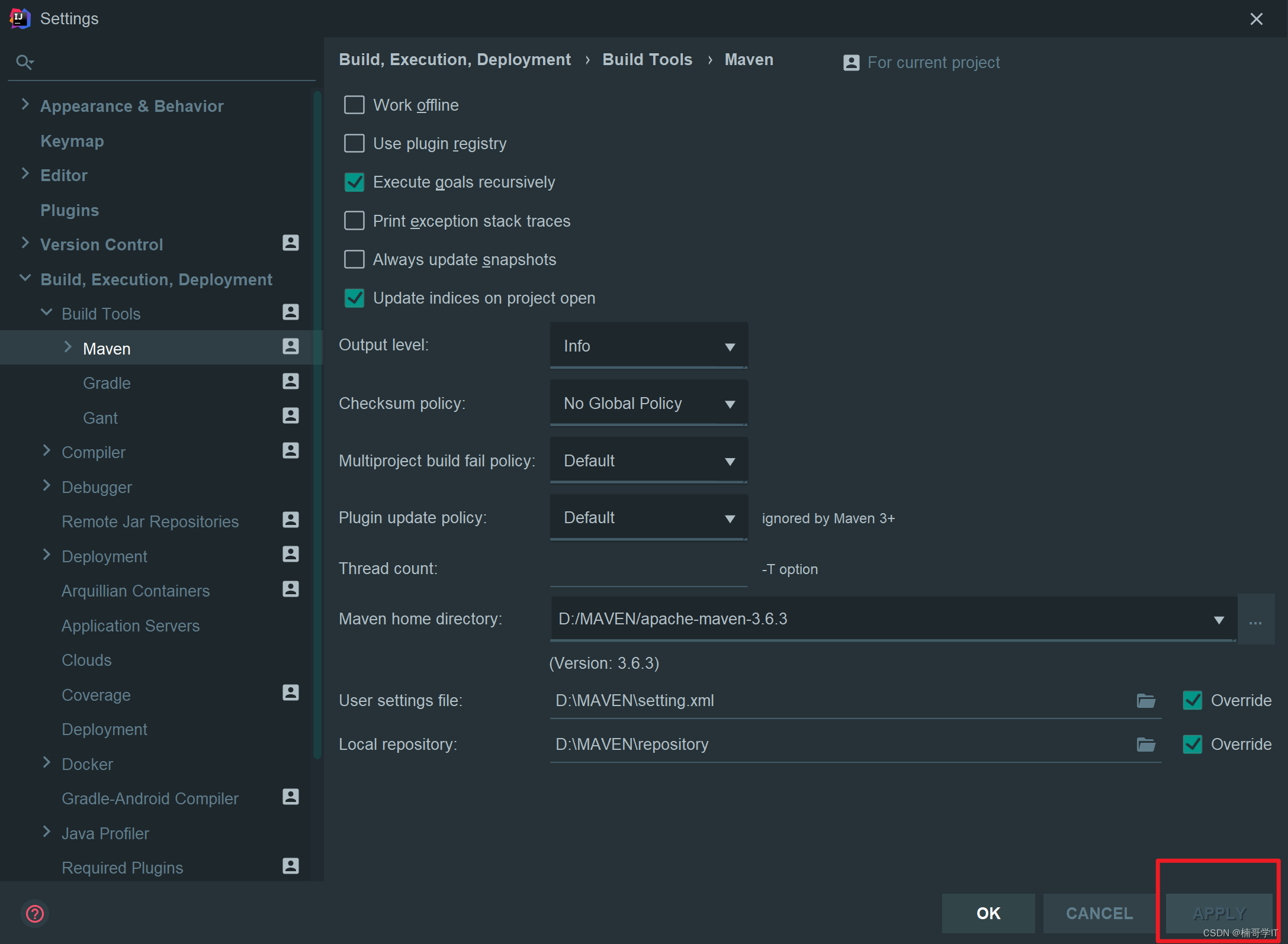 将maven中的文件路径,xml,repository设置好之后就可以点击apply使用了。