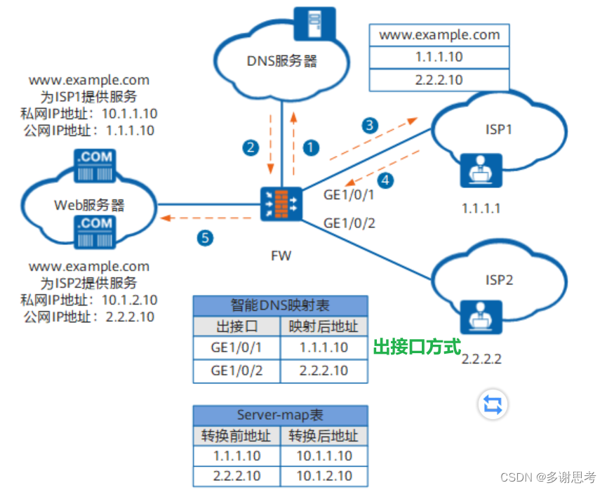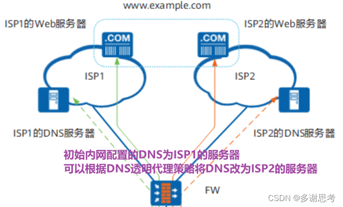 企业内网部署DNS服务器,当外网通过域名访问企业内网Web服务器时,通过内网的DNS服务器解析出Web服务器的公网IP地址(假设此公网IP地址属于ISP1),但是当ISP2的用户访问此Web服务器时,就需要绕到ISP1进行访问,这样就可能导致ISP1网络阻塞,ISP2网络闲置。