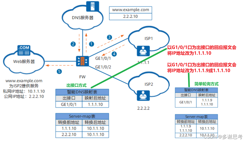 智能DNS功能,根据智能DNS映射表,将DNS回应报文中的解析地址进行修改(如果果之前时ISP1的公网地址1.1.1.1,则可以修改为ISP2的公网地址2.2.2.2),保证流量最短路径,业务体验最优。