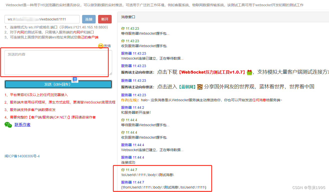 }以上代码完成了websocket的接入,可以用在线的websocket测试网站测试