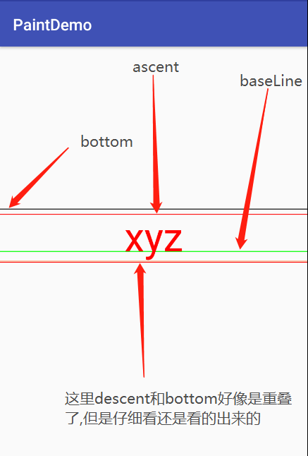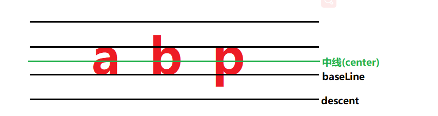 小时候写英文字母的格子总知道吧,就是这样子的,假设他们的行间距都是一样的,注意最上面的那条不是ascent,不信你可以用ascent - descent来算一算是不是和rect.height()一样,很遗憾的告诉你不是的,很明显,我们需要把center下移到baseLine的地方就可以了,那么一看就知道,需要下移的距离公式 distance = text的高度(rect.height()) - descent ,生活处处有惊喜,哈哈哈,至少我解决了这个问题是很开心的!现在彻底明白了是怎么回事了吧,这里我试了一下descent和bottom几乎都是重合的,有时间再回头好好研究一下!