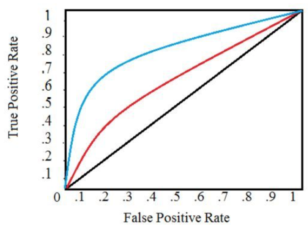 黑色是随机分类器,每个给定的模型只能对应一条曲线,通过调整对正例进行分类的阈值来沿着曲线移动,降低阈值时向右上方移动。在阈值为 1.0 的情况下,我们将位于图的左下方,因为没有将任何数据点识别为正例,这导致没有真正例,也没有假正例(TPR = FPR = 0)。当降低阈值时,我们将更多的数据点识别为正例,导致更多的真正例,但也有更多的假正例 ( TPR 和 FPR 增加)。最终,在阈值 0.0 处,我们将所有数据点识别为正,并发现位于 ROC 曲线的右上角 ( TPR = FPR = 1.0 )。