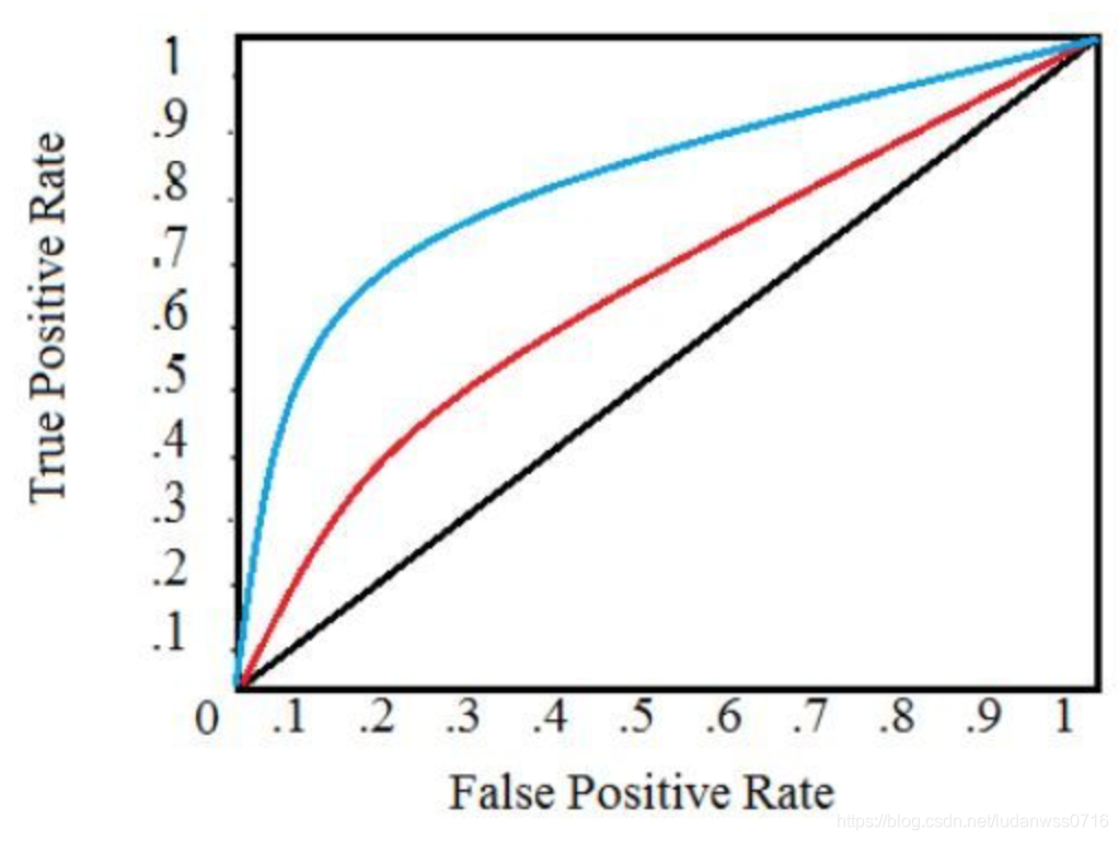 ROC曲线即受试者特征曲线(Receiver Operating Characteristic curve),它展示了当改变在模型中识别为正例的阈值改变时,召回率和精度的关系会如何变化。ROC 曲线在 Y 轴上画出了真正例率(TPR),在 X 轴上画出了假正例率 (FPR)。其中TPR即为召回率,FPR是负例被预测为正例的概率