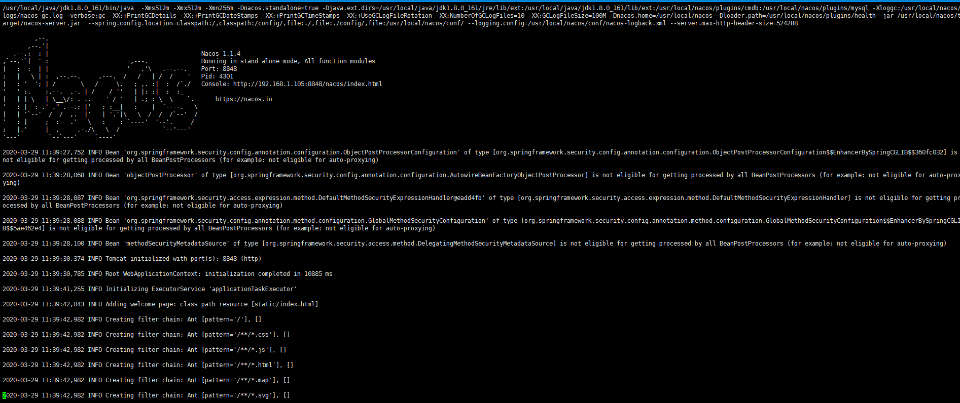 /usr/local/java/jdk1.8.0_161/bin/java -Xms512m -Xmx512m -Xmn256m -Dnacos.standalone=true -Djava.ext.dirs=/usr/local/java/jdk1.8.0_161/jre/lib/ext:/usr/local/java/jdk1.8.0_161/lib/ext:/usr/local/nacos/plugins/cmdb:/usr/local/nacos/plugins/mysql -Xloggc:/usr/local/nacos/logs/nacos_gc.log -verbose:gc -XX:+PrintGCDetails -XX:+PrintGCDateStamps -XX:+PrintGCTimeStamps -XX:+UseGCLogFileRotation -XX:NumberOfGCLogFiles=10 -XX:GCLogFileSize=100M -Dnacos.home=/usr/local/nacos -Dloader.path=/usr/local/nacos/plugins/health -jar /usr/local/nacos/target/nacos-server.jar --spring.config.location=classpath:/,classpath:/config/,file:./,file:./config/,file:/usr/local/nacos/conf/ --logging.config=/usr/local/nacos/conf/nacos-logback.xml --server.max-http-header-size=524288