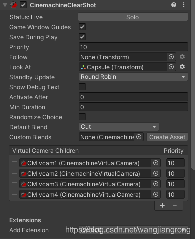 需要注意的是,ClearShot的Look At和Follow属性。若VirtualCamera自身设置了这两个属性,那么就会使用VirtualCamera自身设置的值。若VirtualCamera没有设置,则使用ClearShot设置的值。