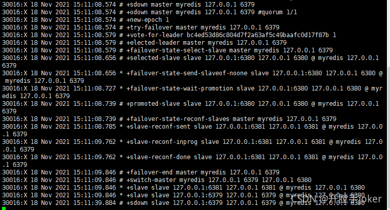 sentinel monitor myredis 127.0.0.1 6379 1后面的数字1,代表主机挂了,slave投票看谁接替成为主机,票数最多的,就会成为主机