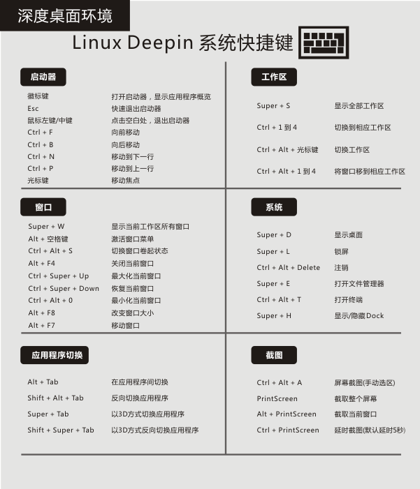 五.deepin常用快捷键 版权声明:本文为zwj1030711290原创文章,遵循CC 4.0 BY-SA版权协议,转载请附上原文出处链接和本声明。原文链接:https://blog.csdn.net/zwj1030711290/article/details/116113894