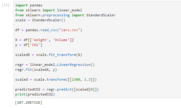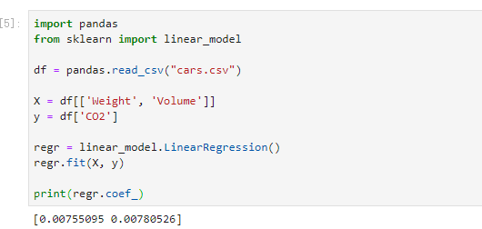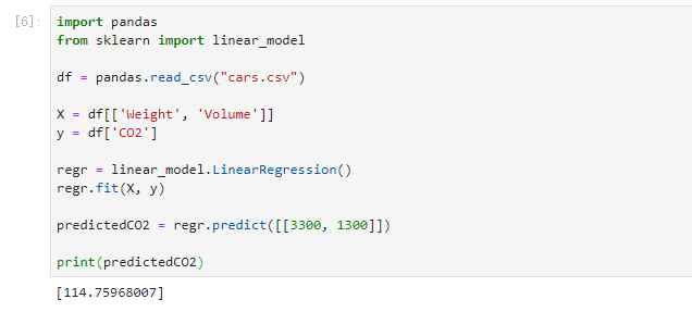 现在,我们有了一个回归对象,可以根据汽车的重量和排量预测 CO2 值: