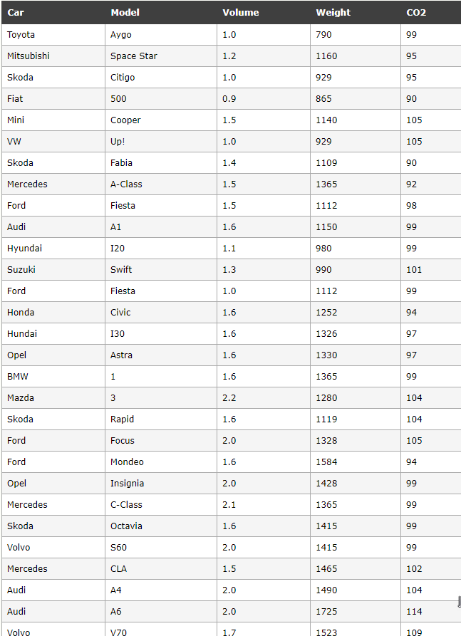 请看下表,它与我们在多元回归一章中使用的数据集相同,但是这次,Volume 列包含的单位是升,而不是 ccm(1.0 而不是 1000)。