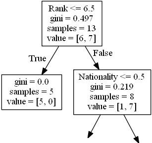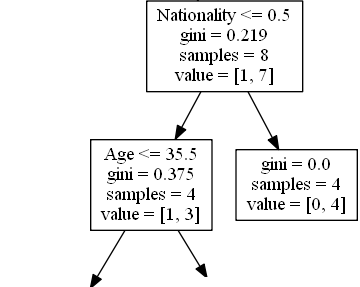 Nationality <= 0.5 表示国籍值小于 0.5 的喜剧演员将遵循左箭头(这表示来自英国的所有人),其余的将遵循右箭头。