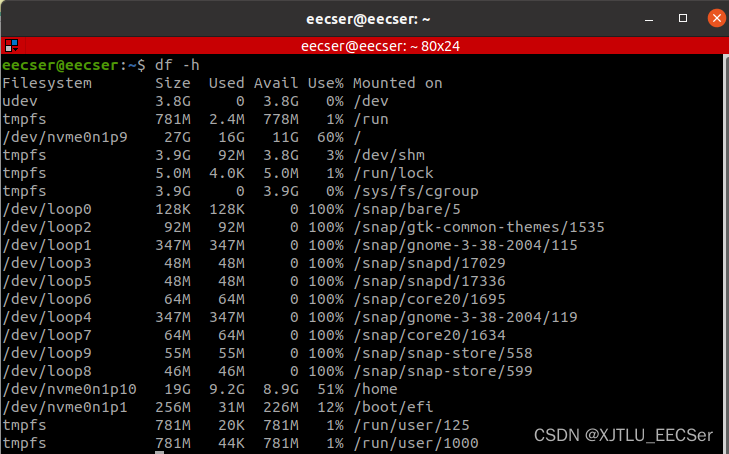 1.先打开终端看一下自己的ubuntu内存的使用情况,命令:df -h