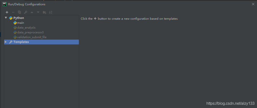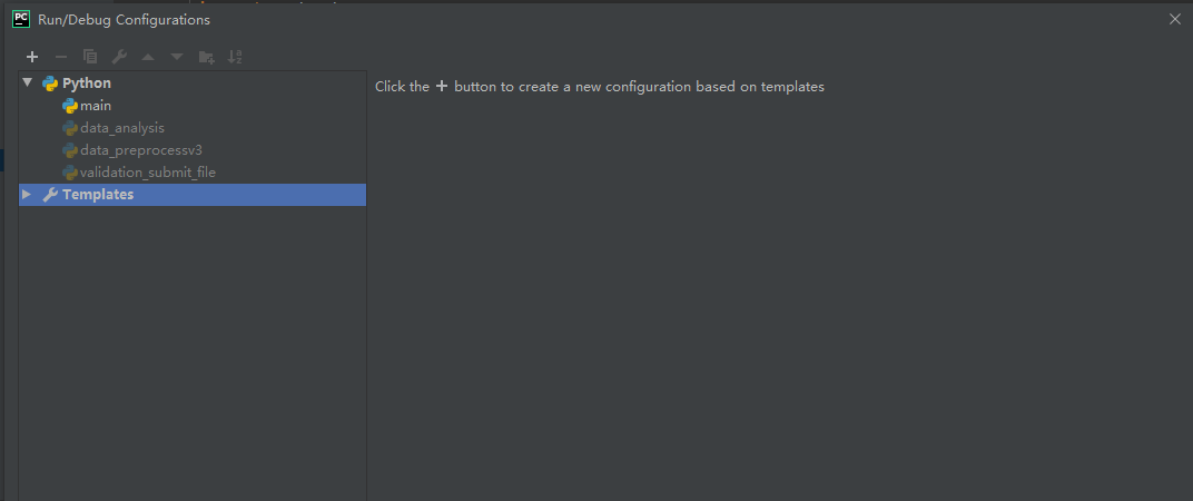 再选择Python,点击左上角’+'号,选择python,此时应该默认就是刚配置的templates,选择ok即可,此时程序就可以以正常模式run和debug了。