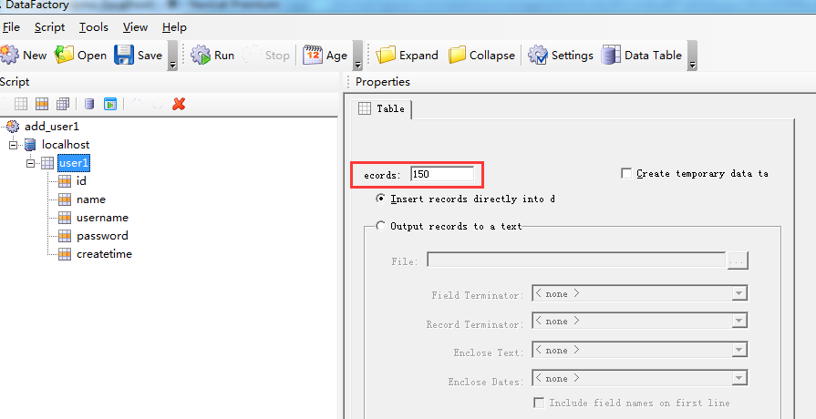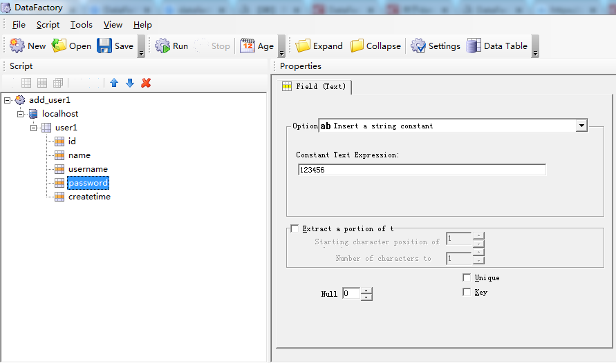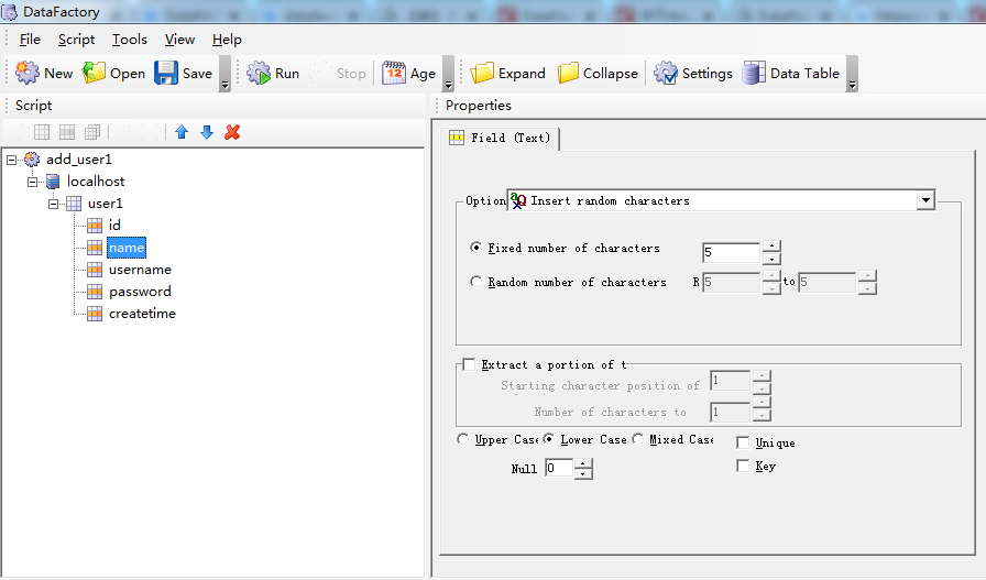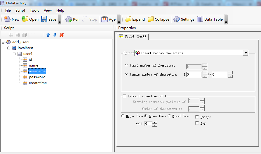 以上 ,我们已经完成了配置,下面我们可以定义出入数据的规则,完成数据的生成了。选中表的字段,不同类型,提供不同数据产生的设置。