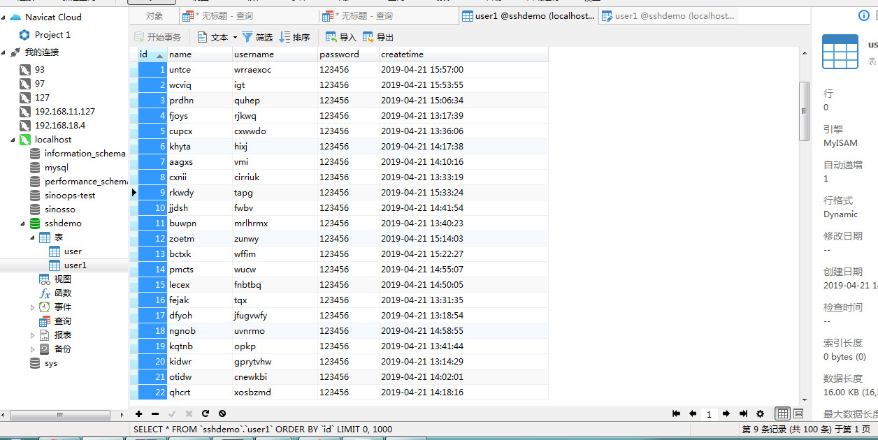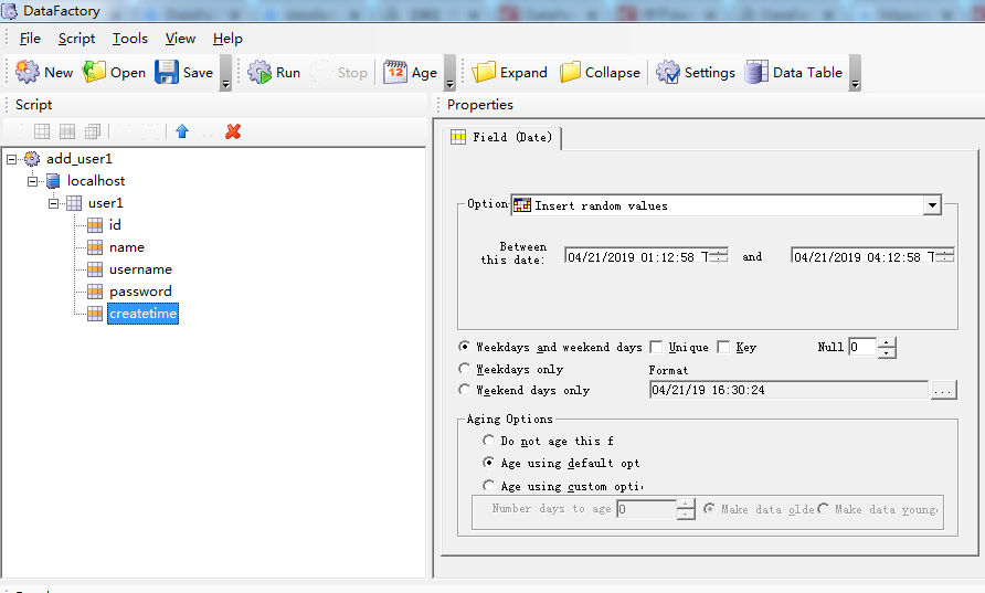 5)createtime为datetime类型,这里设定设定一个随机的时间,时间跨度为2019-4-21 01:12:58到-2019-4-21 04:12:58。