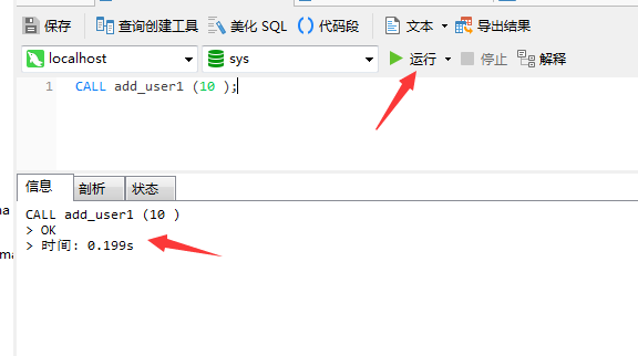 执行可以通过navicat的函数执行,也可以直接执行CALL add_user1 (10 ) 命令。