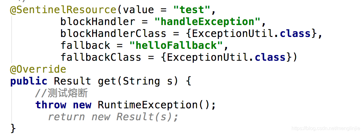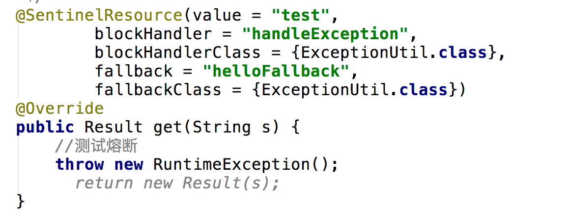 value:资源名称,必需项(不能为空)entryType:entry 类型,可选项(默认为EntryType.OUT)blockHandler/blockHandlerClass:blockHandler对应处理BlockException的函数名称,可选项。blockHandler 函数访问范围需要是public,返回类型需要与原方法相匹配,参数类型需要和原方法相匹配并且最后加一个额外的参数,类型为BlockException。blockHandler 函数默认需要和原方法在同一个类中。若希望使用其他类的函数,则可以指定blockHandlerClass为对应的类的Class对象,注意对应的函数必需为 static函数,否则无法解析。fallback:fallback 函数名称,可选项,用于在抛出异常的时候提供 fallback 处理逻辑。fallback 函数可以针对所有类型的异常(除了exceptionsToIgnore里面排除掉的异常类型)进行处理。fallback 函数签名和位置要求:- 返回值类型必须与原函数返回值类型一致;