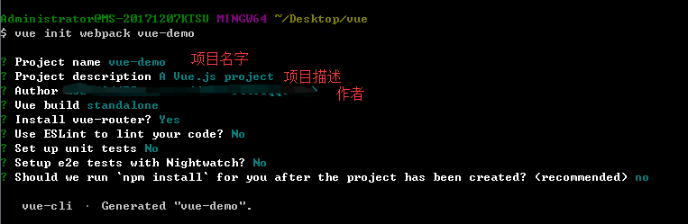 2、进入项目目录,创建一个基于webpack模板的新项目: vue init webpack 项目名