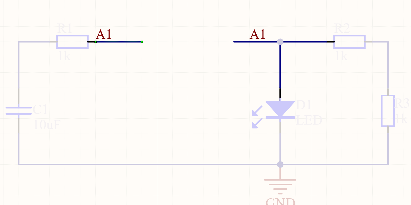 我们使用网络标签连接两个导线时,可以通过【Alt + 左键单击】该网络来寻找同样的网络,如图所示,对于同样的网络会高亮显示