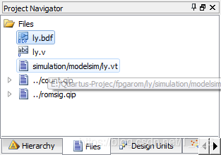 - 先设计这两个模块,之后建立项目,链接完上述原理图之后。开始把原理图文件转换成文本格式,即(.v)文件。和Test Bench。然后在文件里添加这两个文件。如下图:ly.v和ly.vt.这里是verilog HDL语言。之后一定要删除ly.bdfly.bdf文件。