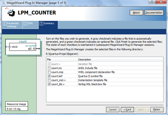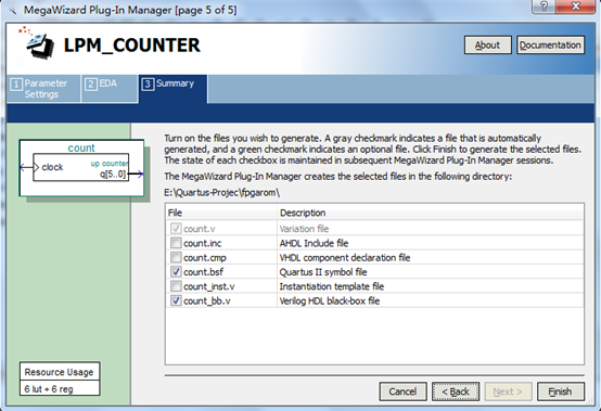 3. 在设置完计数器LPM_COUNTER后,要对count.bsf勾选。不然原理图链接是没这个元件。